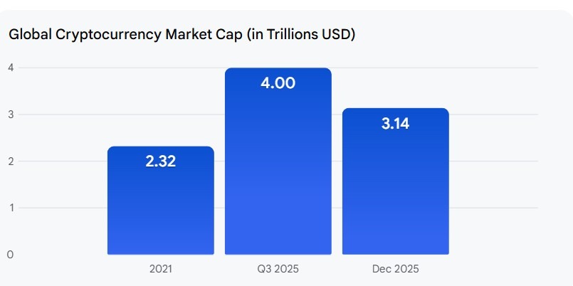 Between 2021 and 2025, the total market capitalization of cryptocurrencies grew from $2.32T to over $3.14T.