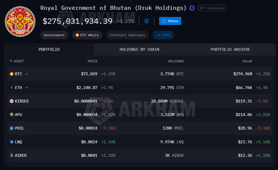 Berdasarkan data arkham, entitas Royal Government of Bhutan (Druk Holdings) tercatat memiliki total portofolio sekitar US$275,03 juta. Porsi utamanya datang dari 3.774 BTC senilai sekitar US$274,96 juta, sementara aset lain hanya berukuran sangat kecil.
