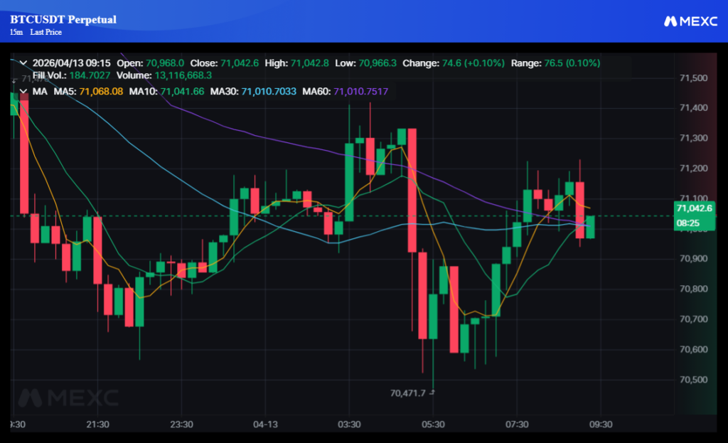Bitcoin kembali melemah pada 13 April setelah AS mengumumkan blokade terhadap akses maritim Iran menyusul gagalnya pembicaraan damai dengan Tehran. Dalam pergerakan setelah pengumuman itu, BTC turun ke bawah US$71.000 dan sempat menyentuh area US$70.600, menandai kembalinya tekanan risk-off ke market kripto.