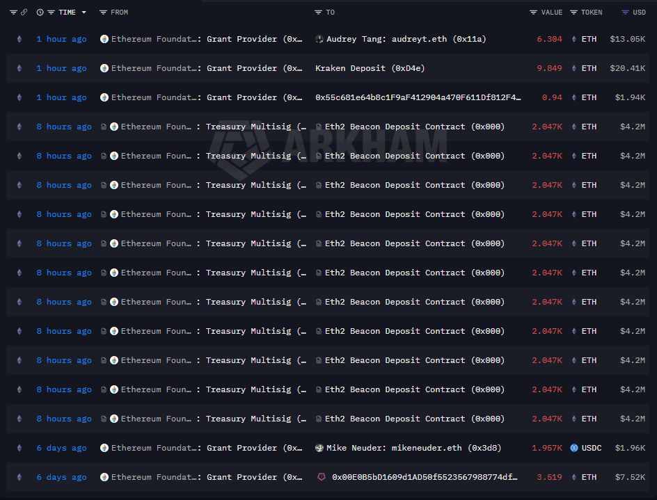 Ethereum Foundation kembali meningkatkan alokasi staking treasury dengan deposit 22.517 ETH ke Ethereum Beacon Deposit Contract. Berdasarkan data Arkham Intelligence, transaksi ini dilakukan dalam 11 deposit terpisah, masing-masing sekitar 2.047 ETH, dengan total nilai sekitar US$46,2 juta.