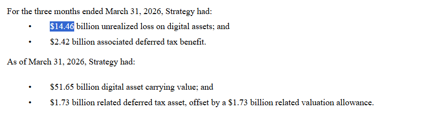 Laporan resmi ke SEC menunjukkan Strategy mencatat unrealized loss US$14,46 miliar pada kuartal I 2026 dari portofolio bitcoinnya. Perusahaan juga melaporkan associated deferred tax benefit sebesar US$2,42 miliar, sehingga tekanan akuntansi dari penurunan harga BTC sebagian diimbangi oleh manfaat pajak tangguhan.