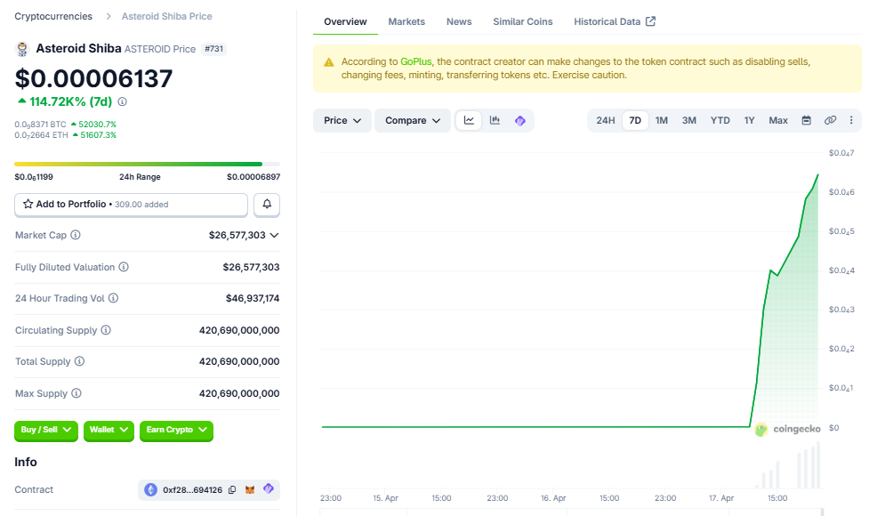 ASTEROID sempat menyentuh all-time high di sekitar US$0,00006897 pada 17 April. Range 24 jamnya bergerak dari sekitar US$0,0000001199 hingga US$0,00006897, menandakan betapa ekstremnya volatilitas token ini dalam satu sesi perdagangan.