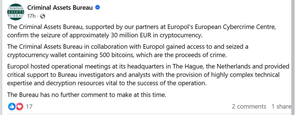 Namun kali ini, Criminal Assets Bureau (CAB) Irlandia menyatakan berhasil mendapatkan akses ke salah satu wallet dengan bantuan European Cybercrime Centre milik Europol.