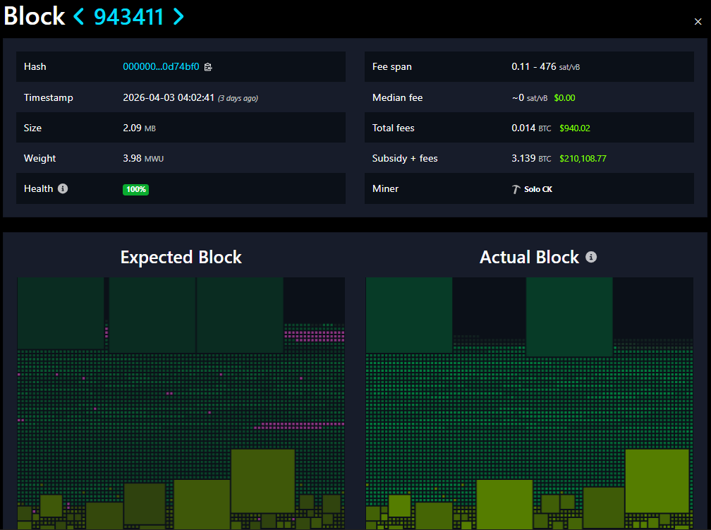 Block 943.411 juga menjadi solo block ke-312 yang ditemukan lewat CKpool sejak layanan itu berjalan pada 2014. Kemenangan ini mengakhiri jeda sekitar 33 hari sejak kemenangan solo terakhir yang tercatat pada 28 Februari.
