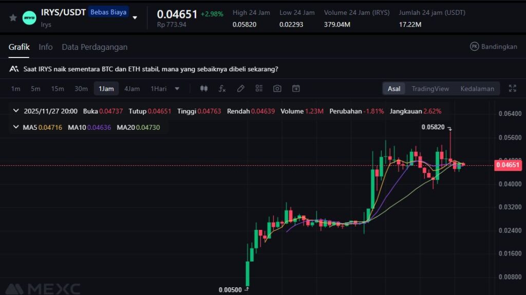 Selain itu, pertumbuhan aktivitas pada Irys Arcade serta spekulasi seputar potensi airdrop menjelang peluncuran mainnet turut memperkuat momentum kenaikan. IRYS kini menjadi salah satu aset paling aktif di MEXC dengan lonjakan volume perdagangan yang signifikan.