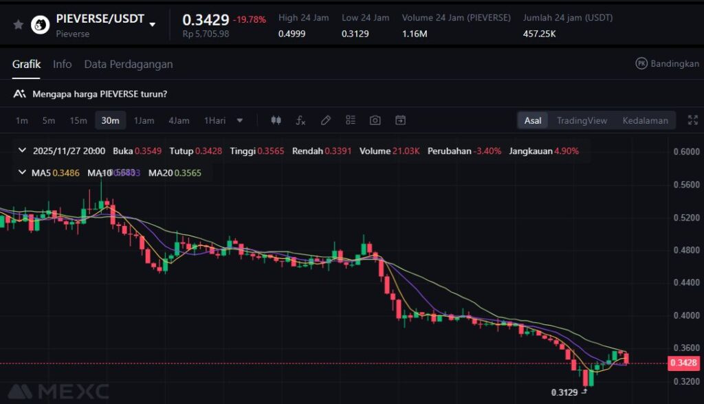 Token PIEVERSE anjlok -31.56% ke $0.3198, tertekan oleh minimnya arus modal baru di sektor Web3 dan AI. Meskipun proyek ini dikenal memiliki teknologi kuat dalam integrasi data on-chain, kondisi market global yang lesu memicu tekanan jual lebih besar.