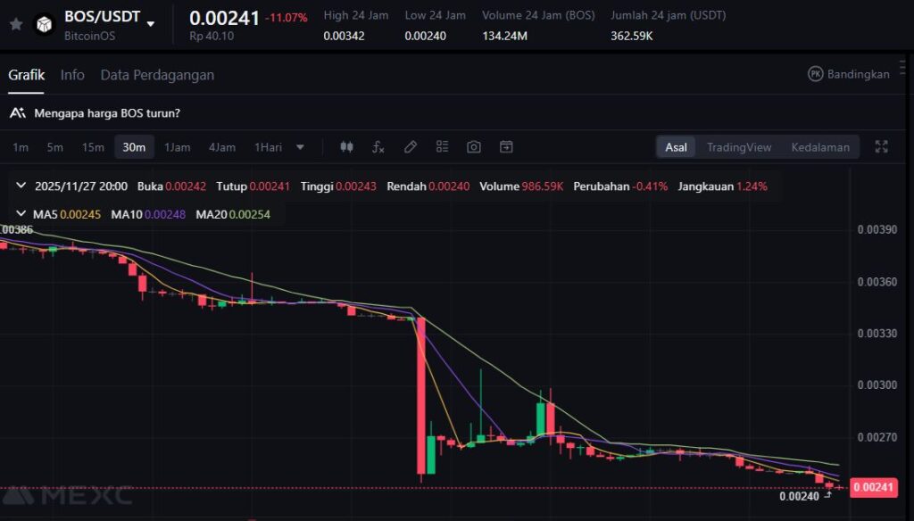 Token BOS melemah -27.11% ke $0.0024, memasuki fase koreksi setelah reli kuat di awal bulan. BOS dikenal sebagai proyek Layer-2 berbasis Bitcoin yang menambah fungsi smart contract ke ekosistem BTC.