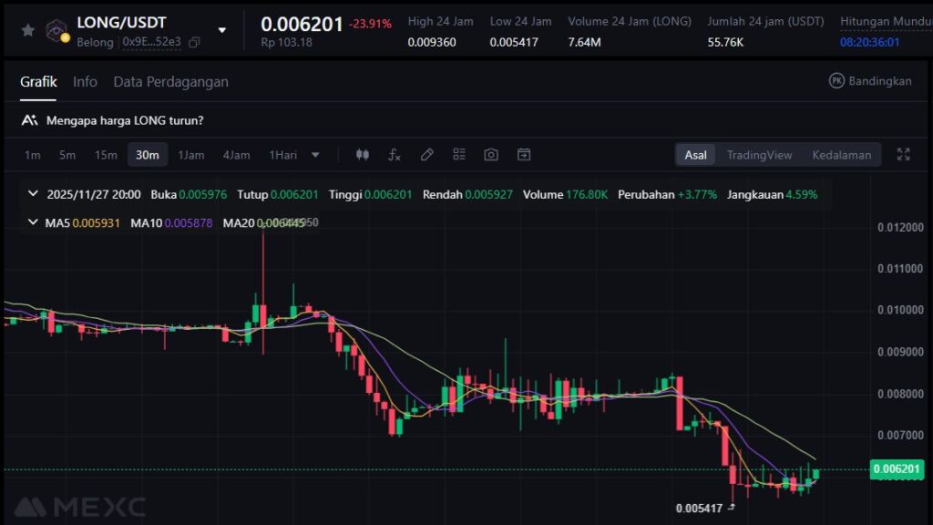 Token LONG terkoreksi -25.69% ke $0.0059, melanjutkan tren penurunan selama dua hari berturut-turut. Pelemahan harga ini disebabkan oleh volatilitas tinggi dan penurunan minat trader harian di beberapa exchange minor.
