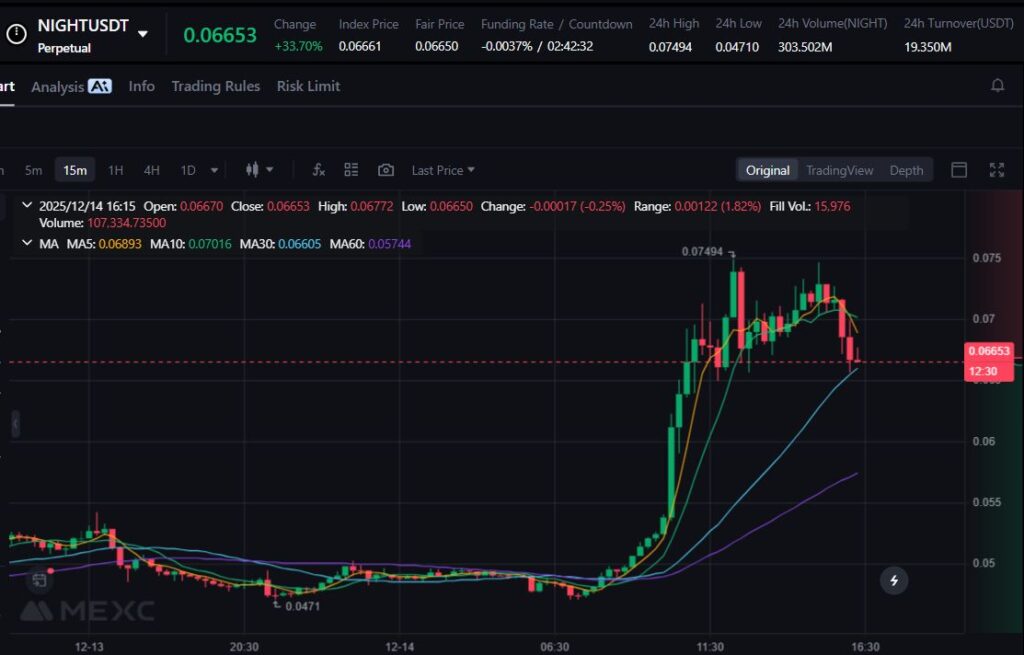 NIGHT naik 48.62% seiring meningkatnya perhatian pada proyek-proyek privasi dan Zero-Knowledge yang kembali menjadi sorotan. Lonjakan volume dalam 24 jam terakhir memperkuat tren bullish token ini.