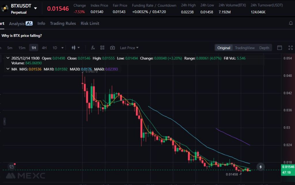 BTX melemah 13.74% akibat rendahnya aktivitas pada proyek-proyek fork Bitcoin. Minimnya katalis baru membuat token ini rentan terhadap penurunan.