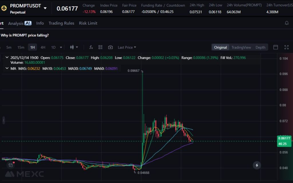 PROMPT terkoreksi 13.52% setelah lonjakan permintaan pada sektor AI agent sebelumnya mulai mereda. Investor mengambil posisi defensif sambil menunggu perkembangan baru.