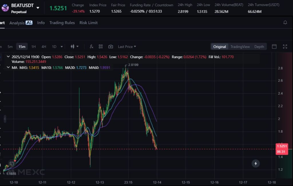 BEAT turun tajam 34.75% setelah reli kuat sebelumnya. Koreksi ini terjadi akibat aksi profit-taking pada token hiburan Web3 yang cenderung memiliki volatilitas tinggi.