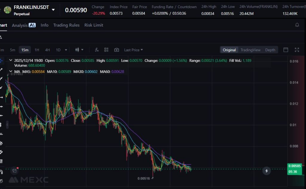 FRANKLIN melemah 18.79% mengikuti turunnya momentum pada sektor memecoin bertema karakter. Tekanan jual dari trader jangka pendek semakin menekan harganya hari ini.