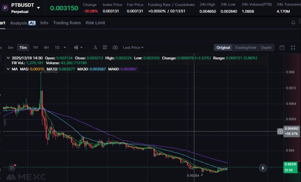 PTB terkoreksi 29.78% setelah reli kuat pada hari sebelumnya. Profit-taking dari trader menjadi penyebab utama penurunan.