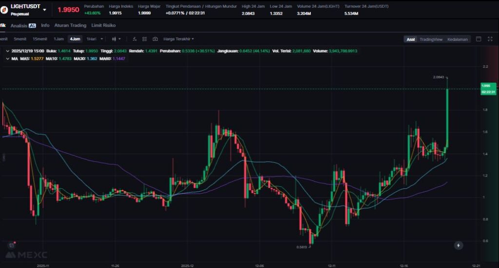 LIGHT naik 43.55% setelah munculnya sentimen positif pada token utilitas yang berkaitan dengan ekosistem on-chain ekonomi.