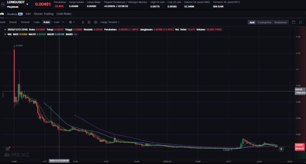LONG melemah 23.08% setelah volatilitas tinggi dalam sektor komunitas dan meme-token.