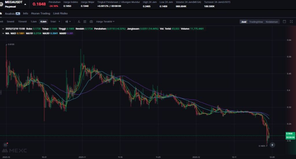 MEGA turun 22.81% di tengah melemahnya sentimen pada token AI/L2 yang masih dalam tahap awal adopsi.