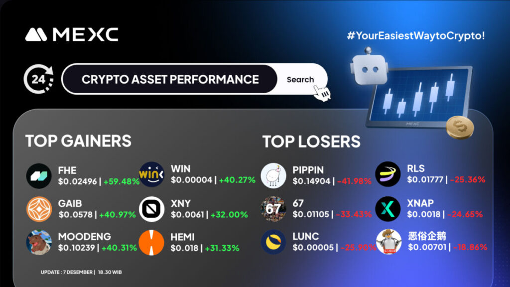 Pasar kripto di MEXC pada 7 Desember 2025 didominasi proyek berbasis AI, infrastruktur, dan privasi data di sisi gainers, sementara sektor meme dan RWA mengalami koreksi.
