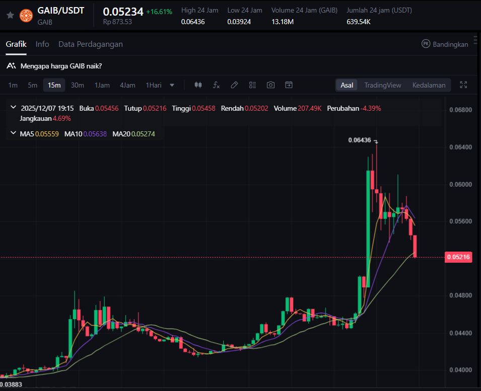 Token GAIB melonjak lebih dari 40% ke $0.0578, menjadi salah satu proyek AI-infrastruktur yang mulai menarik perhatian pasar.