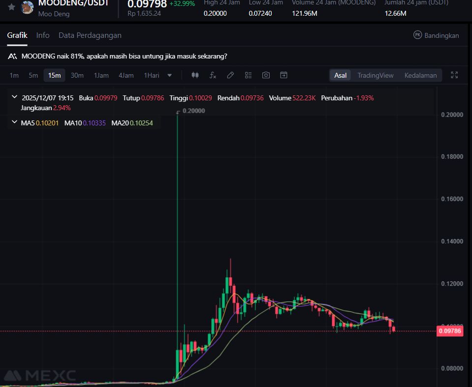 Harga MOODENG naik sekitar 40% ke $0.10239, menandakan kembalinya tren memecoin di jaringan Solana.
