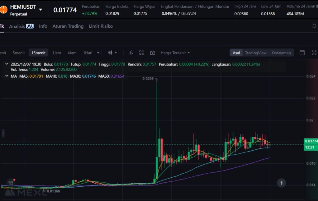 Harga HEMI naik 31% ke $0.018, menutup daftar top gainers hari ini.