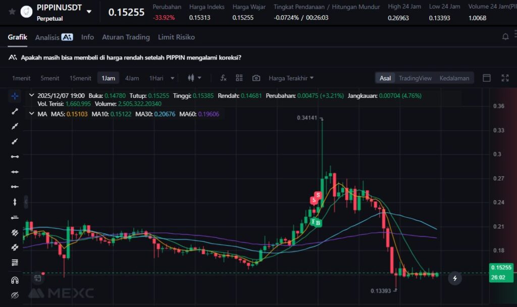 Token PIPPIN terkoreksi hampir 42%, turun ke $0.14904 setelah reli kuat beberapa hari terakhir.