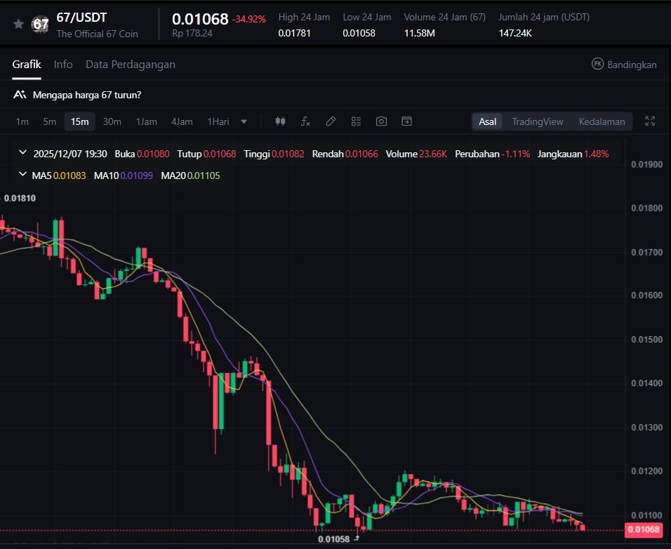 Token 67 turun 33% ke $0.01105, mencerminkan aksi ambil untung pasca reli singkat sebelumnya.