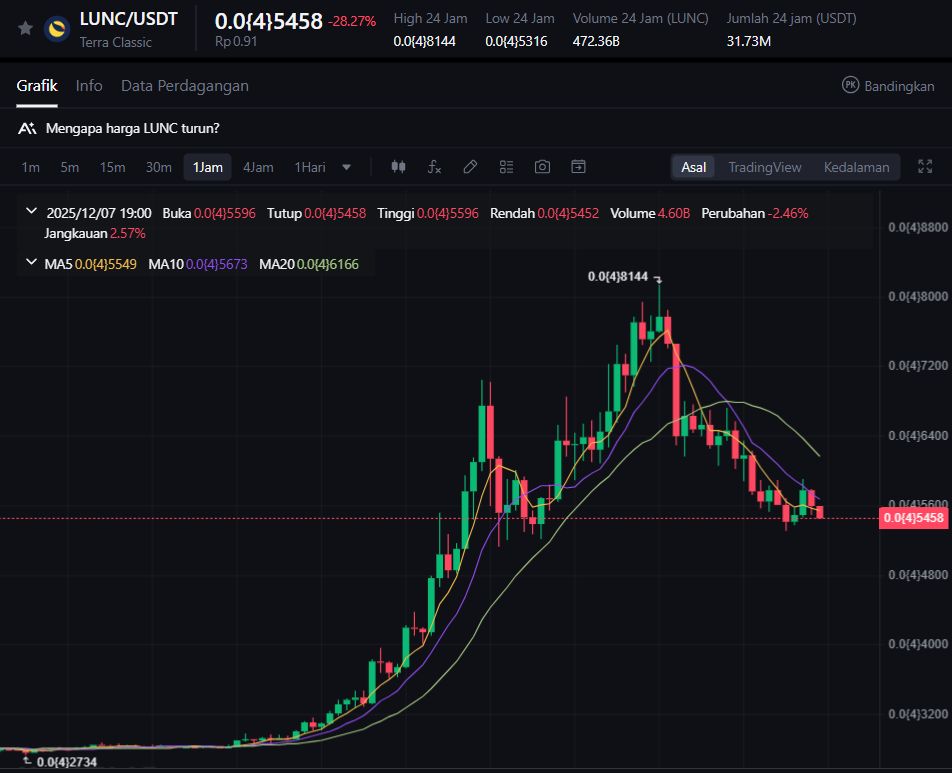 Token LUNC melemah hampir 26% ke $0.00005, melanjutkan tren koreksi sejak awal Desember.