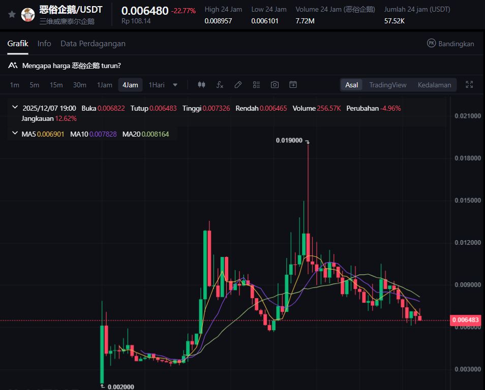 Token bertema Vulgar Penguin turun 18% ke $0.00701, meski aktivitas trading di komunitas Asia Timur masih cukup tinggi.