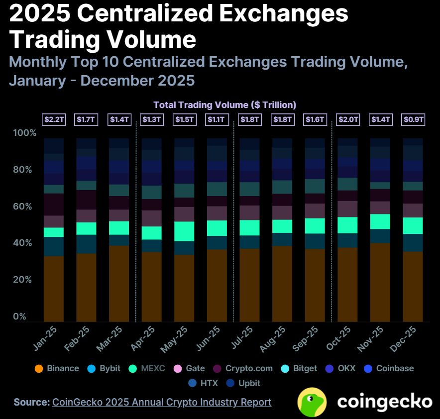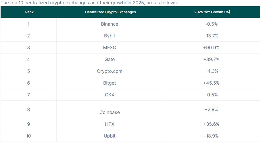 Tidak semua exchange mampu mencatat pertumbuhan di 2025. Data CoinGecko menunjukkan bahwa hanya sebagian CEX besar yang mengalami kenaikan volume, sementara sisanya stagnan atau menyusut.