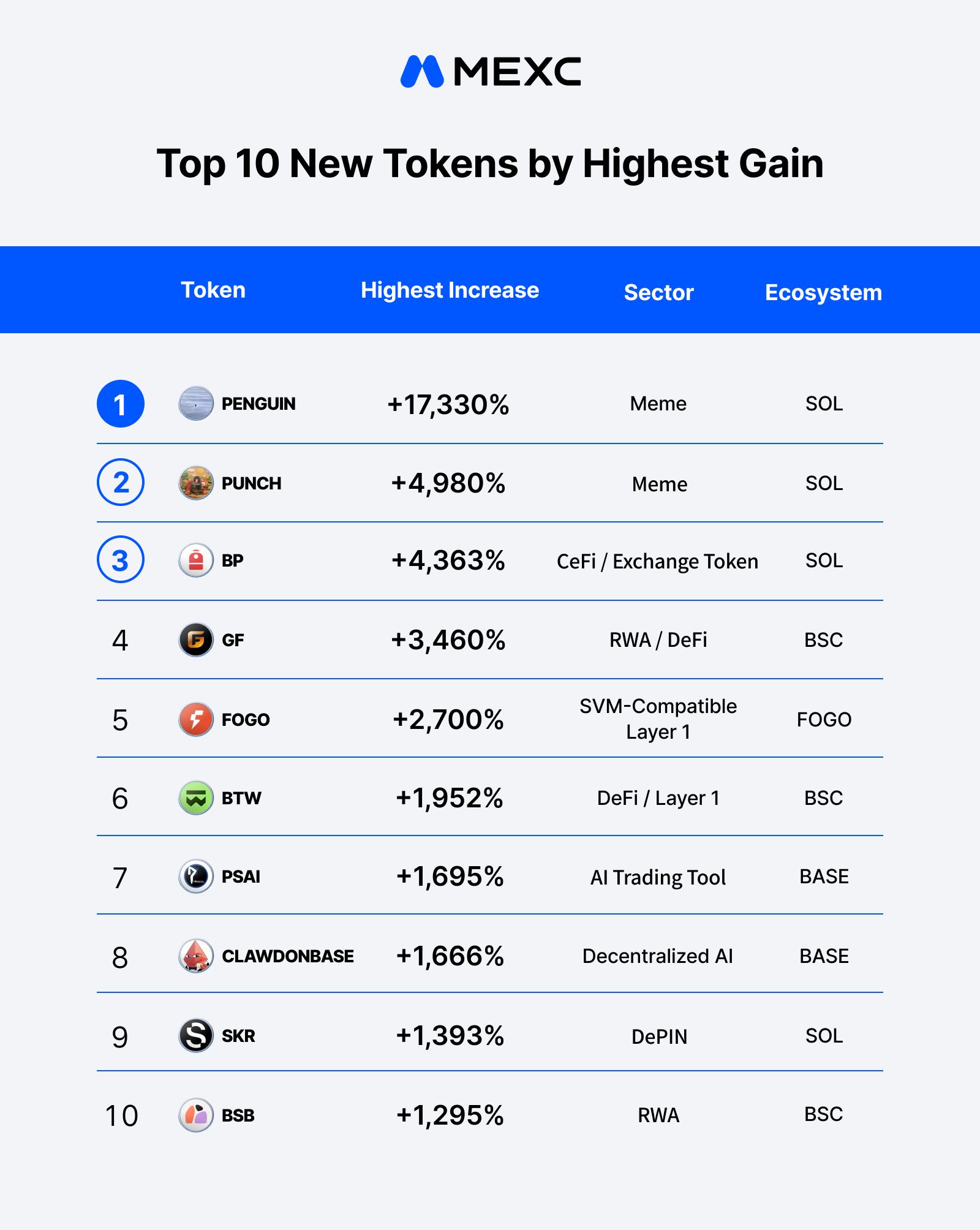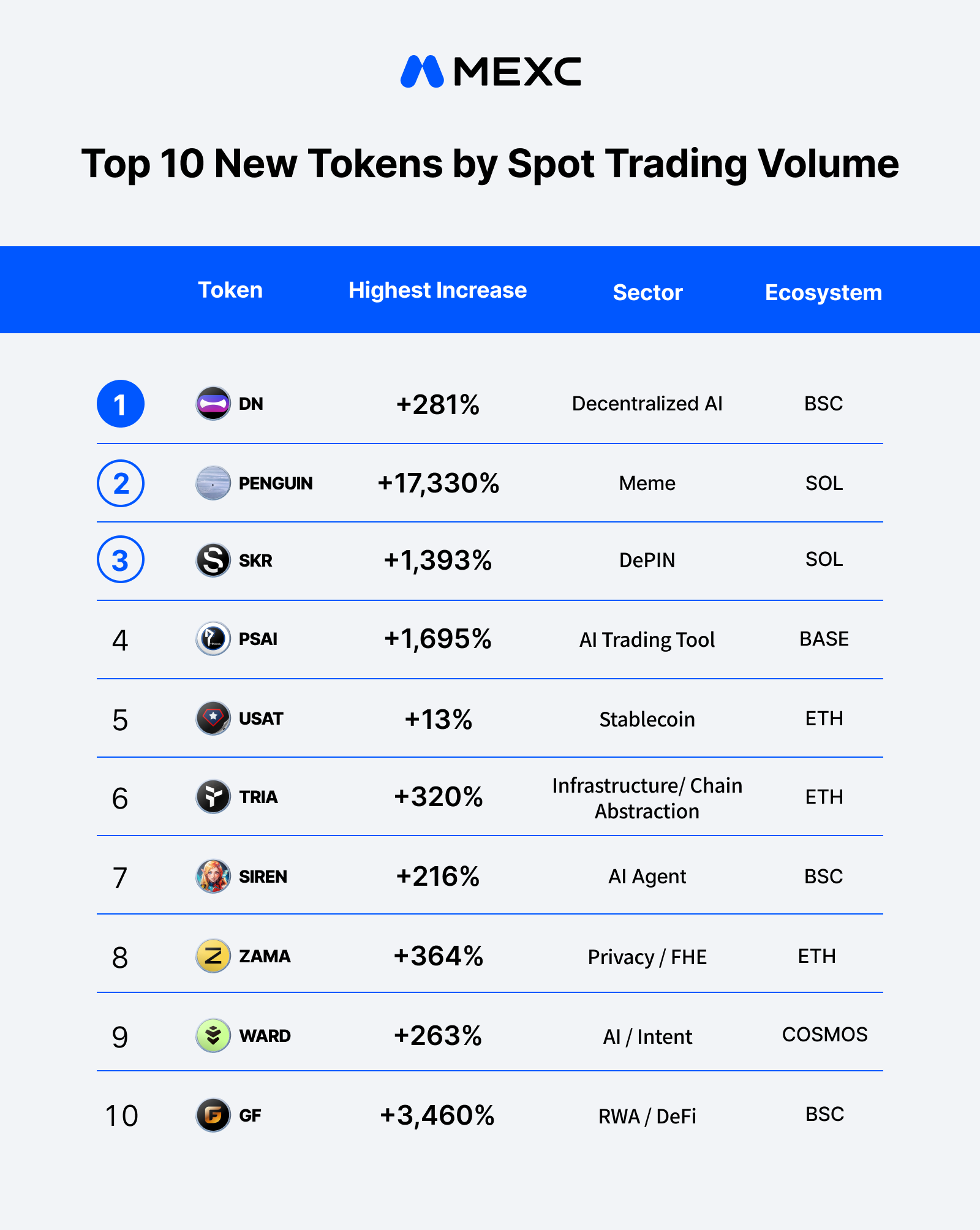 MEXC listed 399 new tokens across Q1 2026. The top 10 tokens by spot trading volume posted an average maximum gain of 2,534%, with the top 10 highest-gaining tokens ranging from +1,295% to +17,330%. SOL led the highest gain list with 4 of 10 spots, while BSC and ETH each placed 3 tokens in the top trading volume rankings, driven by AI and infrastructure projects. While Memes continue to dominate the upper end of the gain spectrum, AI-related tokens claimed 4 of the 10 spots on the trading volume leaderboard, spanning decentralized AI (DN), trading tools (PSAI), AI agents (SIREN), and agent protocols (WARD), confirming AI × Crypto as the most consistent demand-driven narrative of the quarter. RWA tokens (GF, BSB) and exchange tokens (BP) entering the top gainers list in Q1 mark the emergence of new narratives heading into Q2.