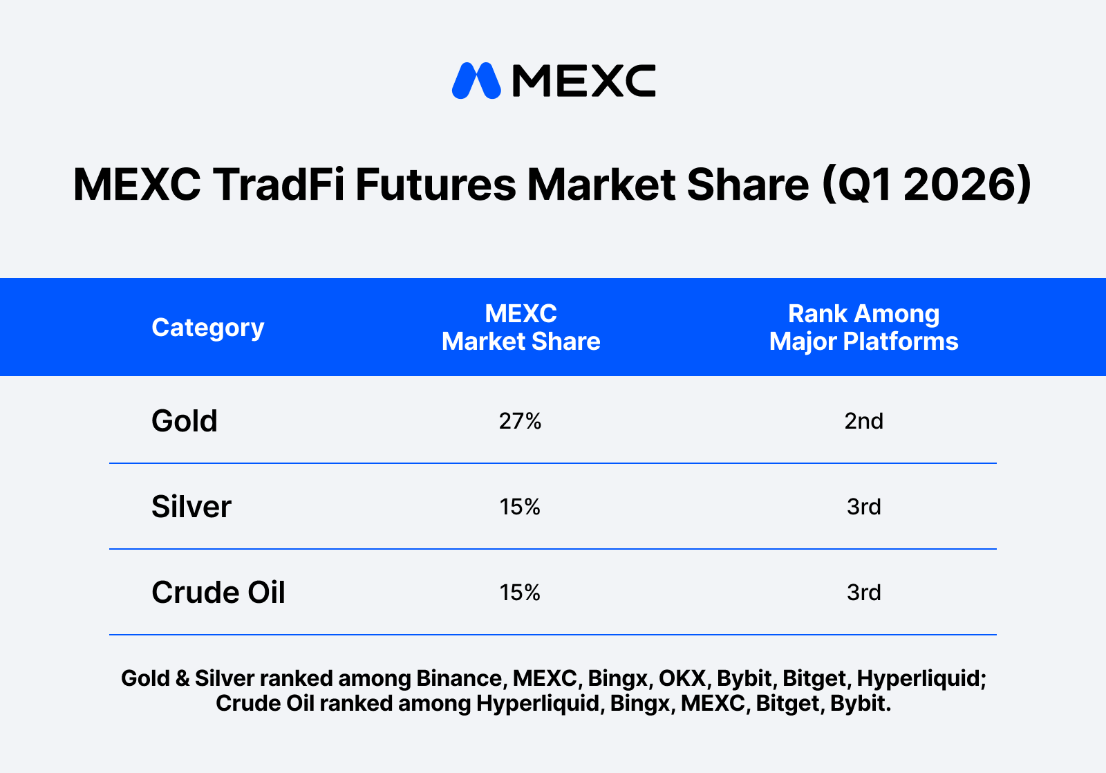 MEXC TradFi Futures delivered strong growth in Q1 2026: the number of listed instruments expanded from 71 in January to 115 in March. Trading volume scaled consistently throughout the quarter, rising approximately 138% month-over-month from January to February and a further 45% in March, representing a quarter-long volume surge of over 246% from January to March. Monthly active traders grew by approximately 59%, reflecting sustained momentum in user engagement. The TradFi ecosystem is accelerating. At the same time, MEXC ranked among the top platforms by market share across multiple asset classes in Q1, placing 2nd in Gold (27%), 3rd in Silver (15%), and Third in Crude Oil (15%), reinforcing its competitive position across key commodity categories.