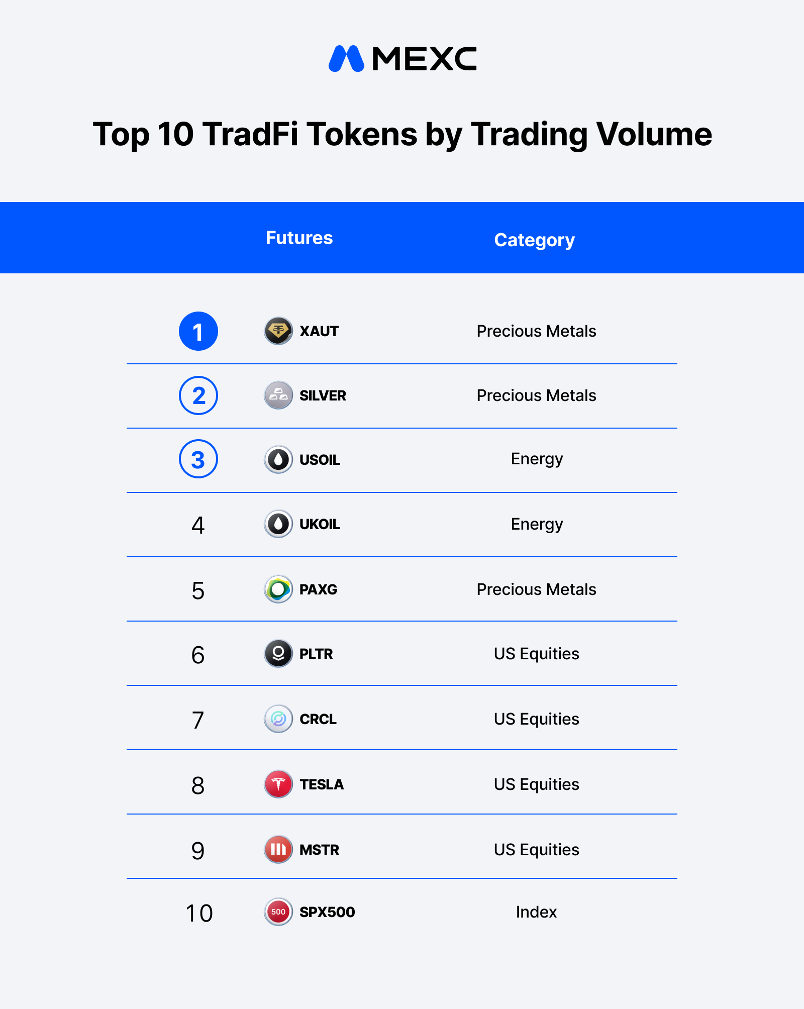In the Q1 trading volume top-10 rankings, Gold (XAUT) and Silver (SILVER) claimed the 1st and 2nd spots respectively, with PAXG at 5th. Crude Oil (USOIL, UKOIL) held 3rd and 4th, underscoring the dominance of precious metals and energy futures and their strong resonance with the prevailing geopolitical climate. On the equities side, four Stock Futures including Palantir (PLTR), Circle (CRCL), Tesla, and MicroStrategy (MSTR) all broke into the top 10, joined by the index future SPX500, collectively demonstrating MEXC TradFi’s full-spectrum coverage from commodities to equity assets.