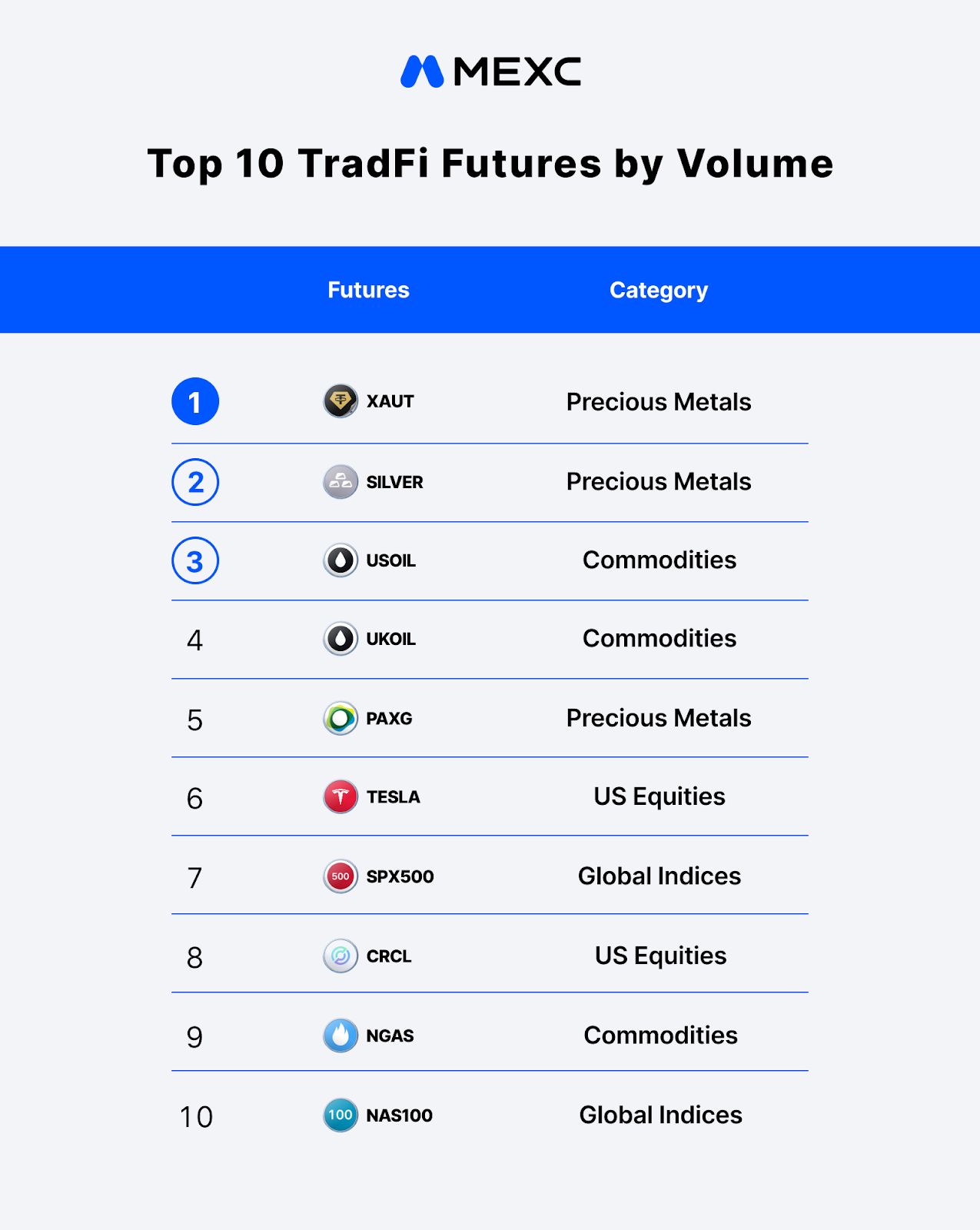 In March, MEXC TradFi contract listings expanded from 87 to 115 instruments, a 33% increase. Total contract trading volume grew 45% MoM, and the number of traders increased 26%. With instruments, volume, and users all growing in tandem, MEXC effectively absorbed the sustained increase in user demand for TradFi contracts.