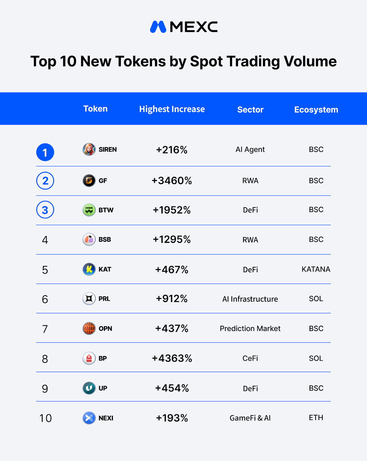 In March, MEXC listed 135 new tokens, with 65% as platform-first listings. New token traders grew 39% month-over-month, and the Top 10 tokens by spot trading volume delivered an average peak gain of 1,375%, reflecting MEXC’s continued ability to identify and capture market hot spots.