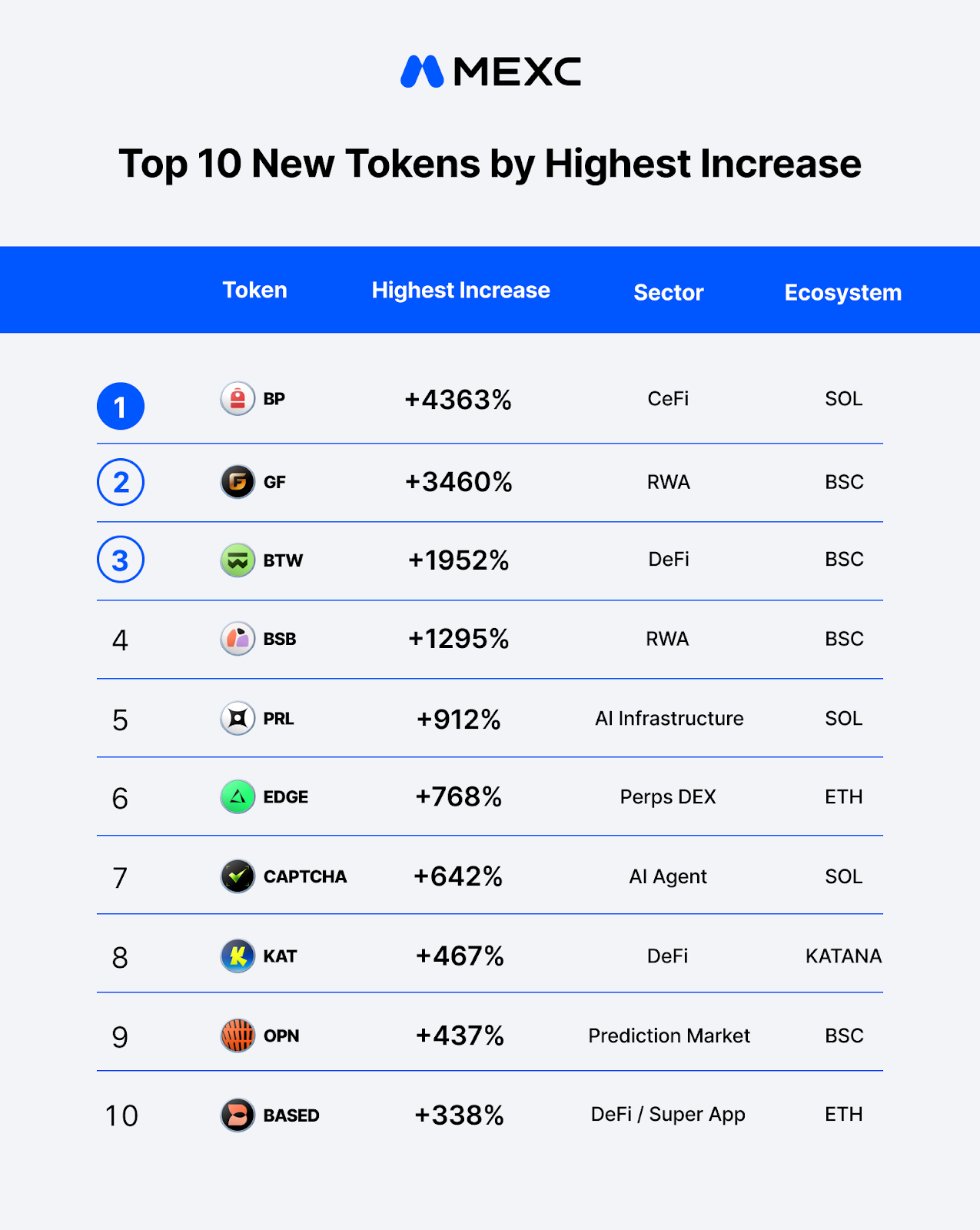 The Top 10 highest-gaining tokens averaged 1,463% in March. BP (+4,363%) topped the list, reflecting the market’s repricing of licensed CeFi exchanges. GF (+3,460%) and BSB (+1,295%) benefited from the genuine demand for traditional asset tokenization amid geopolitical uncertainty, with regulatory clarity further catalyzing capital concentration into the RWA sector. MEXC’s fast-listing advantage allowed users to precisely capture this wave of market action.