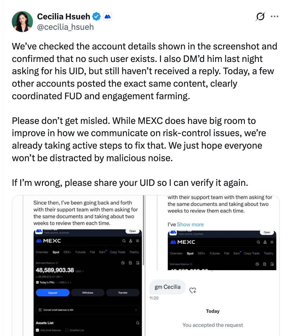We’ve noticed multiple posts sharing similar screenshots and claims about MEXC risk-control cases. Our support team has proactively reached out and requested UIDs to verify and assist, but no valid information has been provided so far.