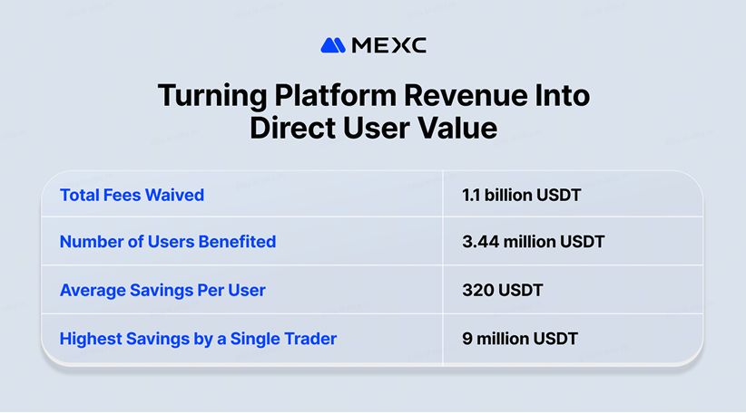 Inisiatif zero-fee memberikan dampak langsung bagi pengguna. Sebanyak 3,44 juta pengguna menghemat total 1,1 miliar USDT dari biaya trading. Rata-rata penghematan per pengguna mencapai 320 USDT, sementara penghematan tertinggi oleh satu pengguna mencapai 9 juta USDT. Strategi ini tidak hanya menurunkan hambatan bagi pengguna ritel, tetapi juga meningkatkan efisiensi modal bagi trader volume besar dan institusi.