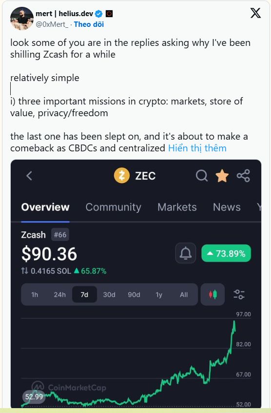It started in early October when Mert Mumtaz, CEO of Helius Labs and a long-time ZEC supporter, posted a thread highlighting privacy as one of crypto’s “three core missions” — alongside markets and value storage. He argued that privacy has been neglected for too long but will soon resurface as a major theme amid the rise of CBDCs and increasing government surveillance.