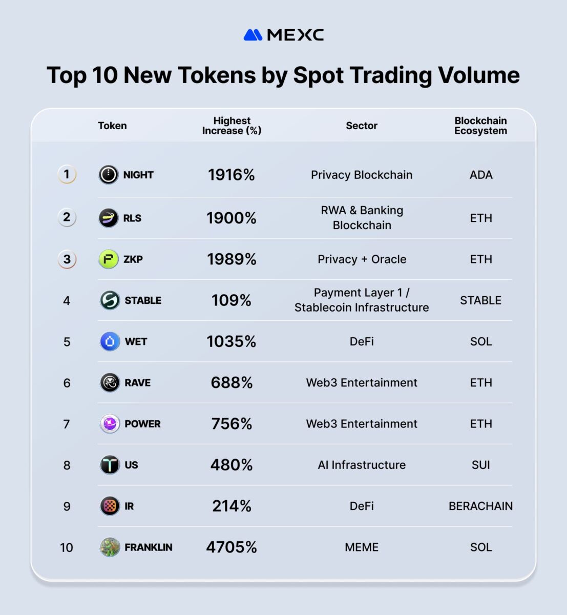 Victoria, Seychelles, January 15, 2026 – MEXC, the fastest-growing global cryptocurrency exchange, redefining a user-first approach to digital assets through true zero-fee trading, reported a significant shift in December trading activity as infrastructure projects captured 50% of top-performing positions, with privacy computing and real-world asset (RWA) tokenization leading capital allocation across the platform’s 110 new token listings.