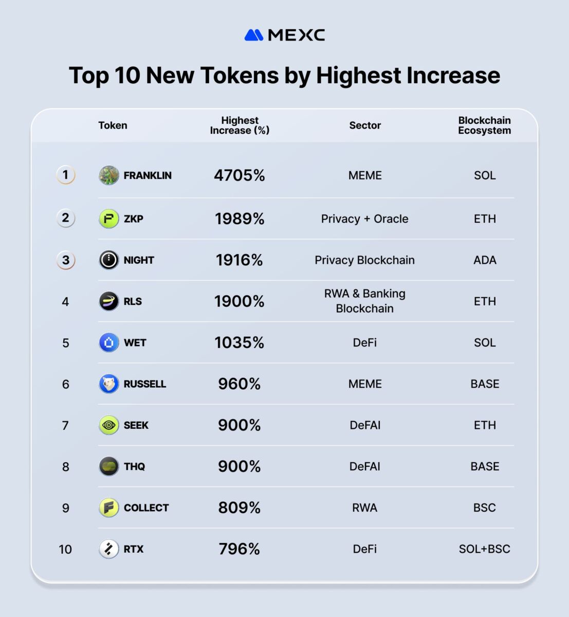 Privacy-focused and real-world asset projects delivered substantial returns. ZKP, NIGHT, and RLS each achieved gains approaching 2,000%, while the DeFAI sector showed strength with SEEK and THQ posting approximately 900% gains across Ethereum and BASE ecosystems.
