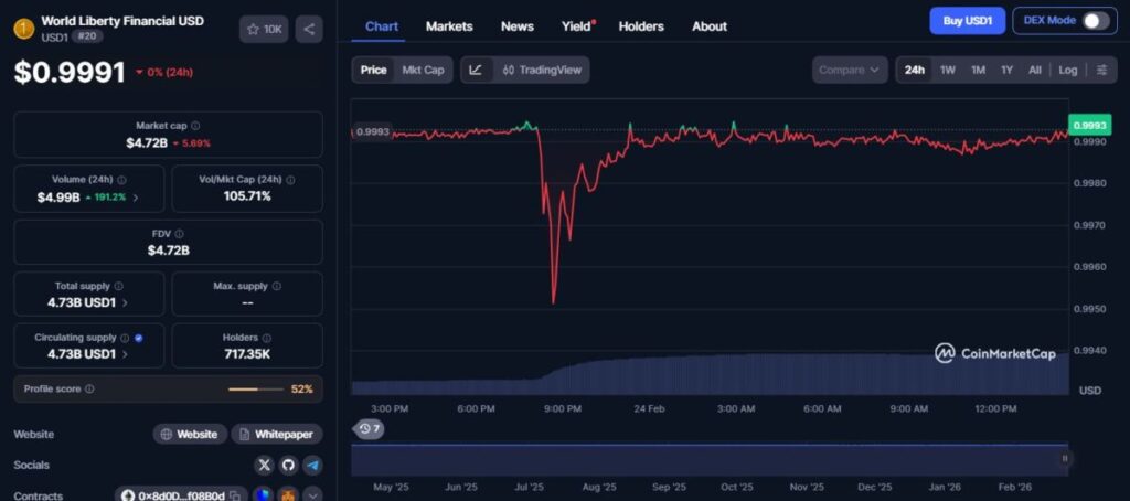 Pada awal perdagangan Senin, USD1 turun hingga sekitar $0,98 di Binance sebelum pulih ke level $1 dalam waktu kurang dari 30 menit. Berdasarkan data pasar, USD1 saat ini merupakan stablecoin terbesar kelima dengan kapitalisasi sekitar $4,8 miliar.