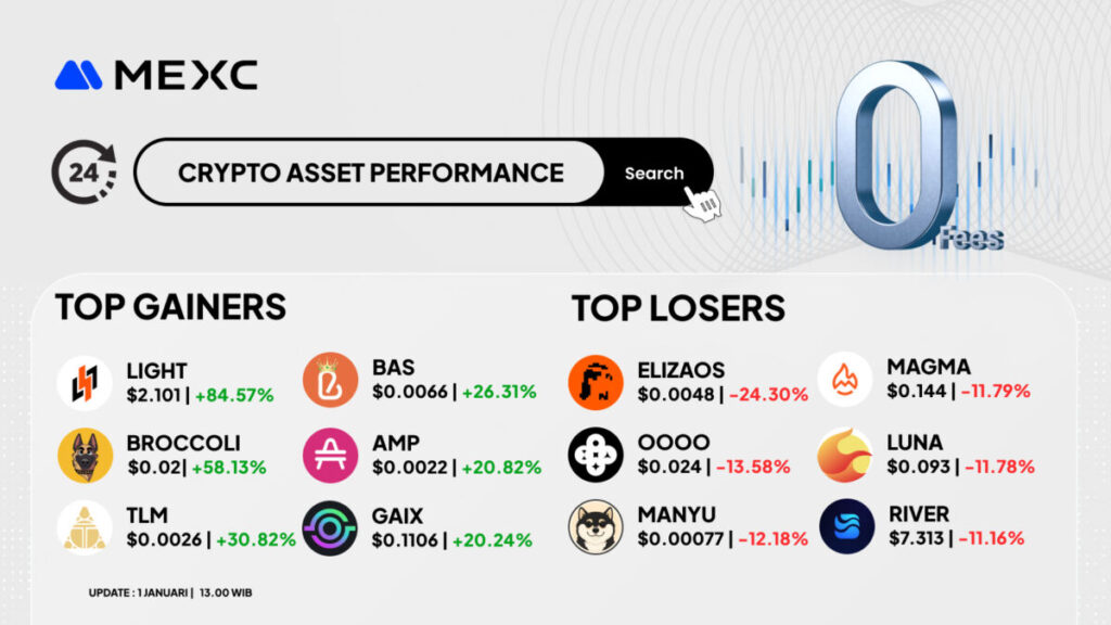 Berikut rangkuman Top Gainers dan Top Losers di MEXC berdasarkan pembaruan 1 Januari 2026, 13.00 WIB.