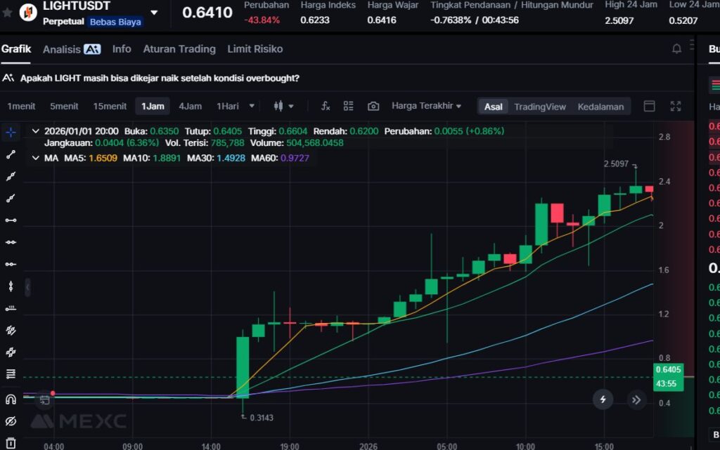 Sesi 1 Januari 2026 memperlihatkan kontras yang jelas: token seperti LIGHT dan BROCCOLI memimpin penguatan dengan kenaikan tajam, sementara ELIZAOS dan beberapa aset lain mengalami koreksi dua digit. Kondisi seperti ini umumnya menandakan market masih selektif—rotasi cepat terjadi, dan momentum bisa berganti dalam waktu singkat.