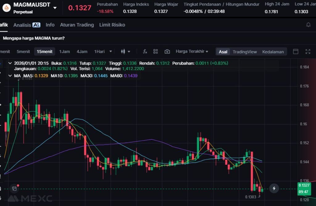 MAGMA turun -11.79% ke level $0.144. Penurunan ini menempatkannya dalam kelompok koreksi harian yang cukup tajam, meski tidak sedalam ELIZAOS.