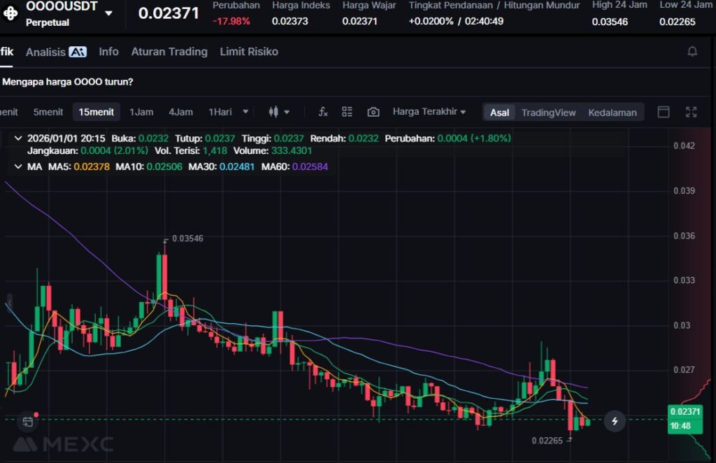 OOOO melemah -13.58% ke $0.024. Pergerakan turun seperti ini sering terjadi pada aset yang masih berada di fase awal, ketika arus likuiditas cenderung cepat masuk-keluar.