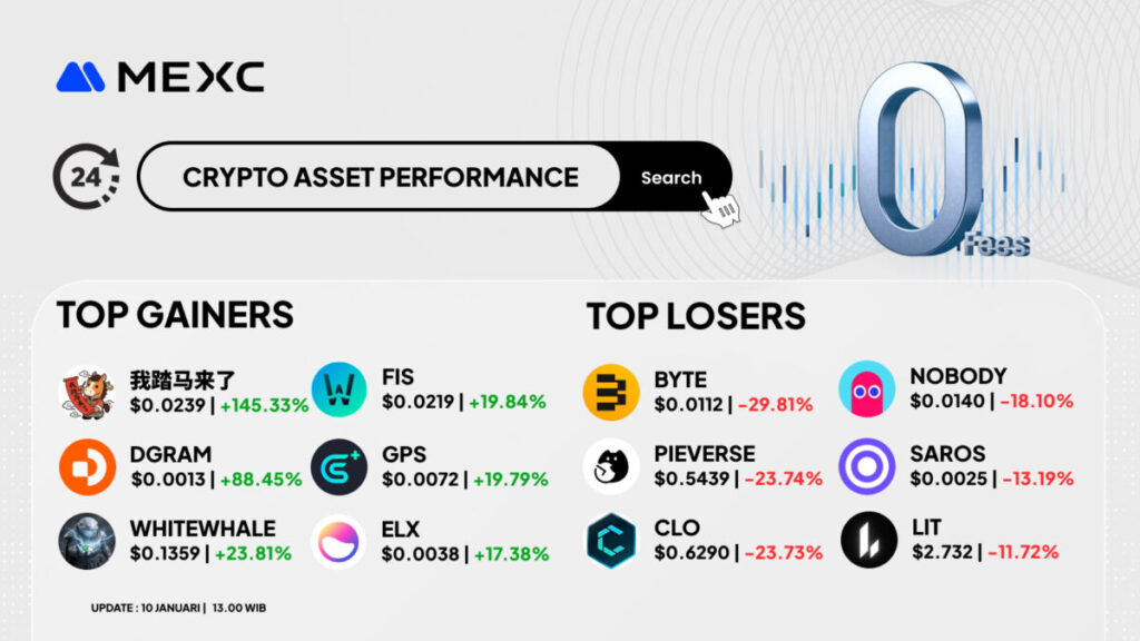 Berikut rangkuman Top Gainers dan Top Losers di MEXC berdasarkan pembaruan 10 Januari 2026, 13.00 WIB: