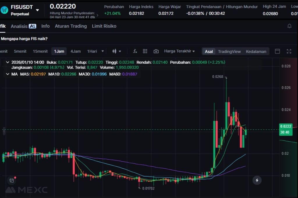 FIS menguat +19.84% dan diperdagangkan di $0.0219. Kenaikan ini menandakan adanya dorongan beli yang cukup solid pada token yang memiliki utilitas jelas di sektor staking.