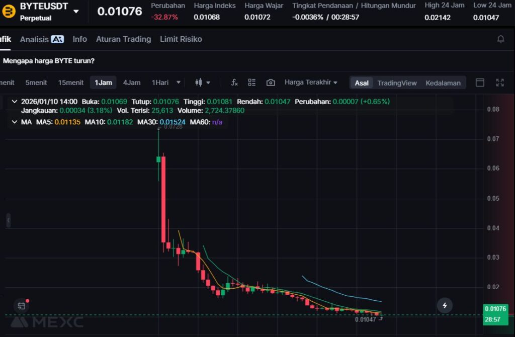 BYTE terkoreksi -29.81% ke harga $0.0112 pada pembaruan terbaru. Penurunan tajam ini menunjukkan tekanan jual yang cukup kuat, sehingga pergerakannya cenderung lebih sensitif terhadap perubahan sentimen dan rotasi likuiditas dalam waktu singkat.