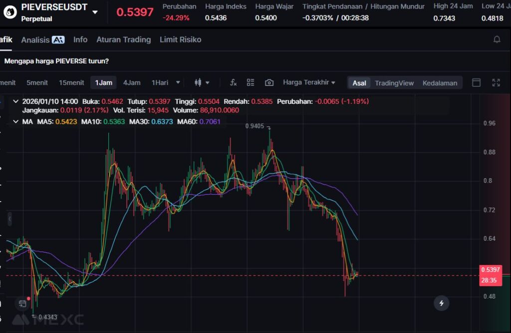 PIEVERSE turun -23.74% dan diperdagangkan di $0.5439. Koreksi ini cukup tajam, menandakan adanya pelemahan minat beli atau aksi ambil untung yang besar di sesi berjalan.